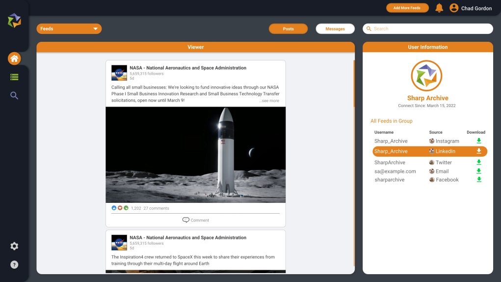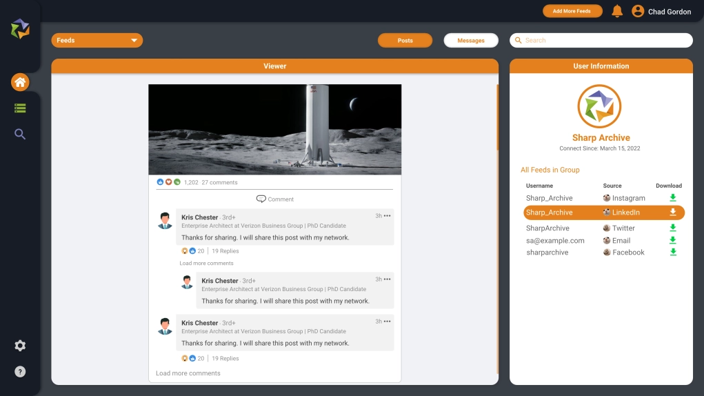 Sharp Archive is an archiving tool that captures all content of LinkedIn, including pictures, videos, posts, likes and comments, for groups in a format that mimics the LinkedIn platform. This makes it easy to review and browse archived content as if it were still on LinkedIn. Sharp Archive utilizes quality LinkedIn archiving software to ensure the safety, security and easy accessibility of your data, providing you peace of mind that your memories and personal information are well preserved for the future.