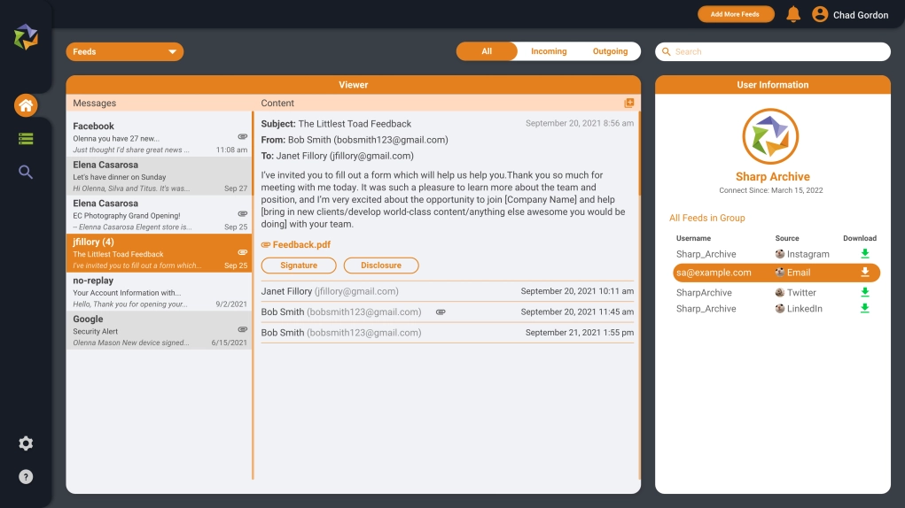 Sharp Archive is a Microsoft email archiving tool that captures all types of Microsoft email account content, such as Inbox, Outbox, Deleted, Spam and Junk Mail, in real-time. It presents the content in a natural format that mimics the look and feel of an email account, allowing for easy searching and filtering of single, group, or all accounts by incoming, outgoing, or all messages. Our Microsoft email archiving tool also allows users to download any content at any time without any additional fees. It is useful for various industries that require email archiving. This ensures that you have a secure and easily accessible copy of your data.